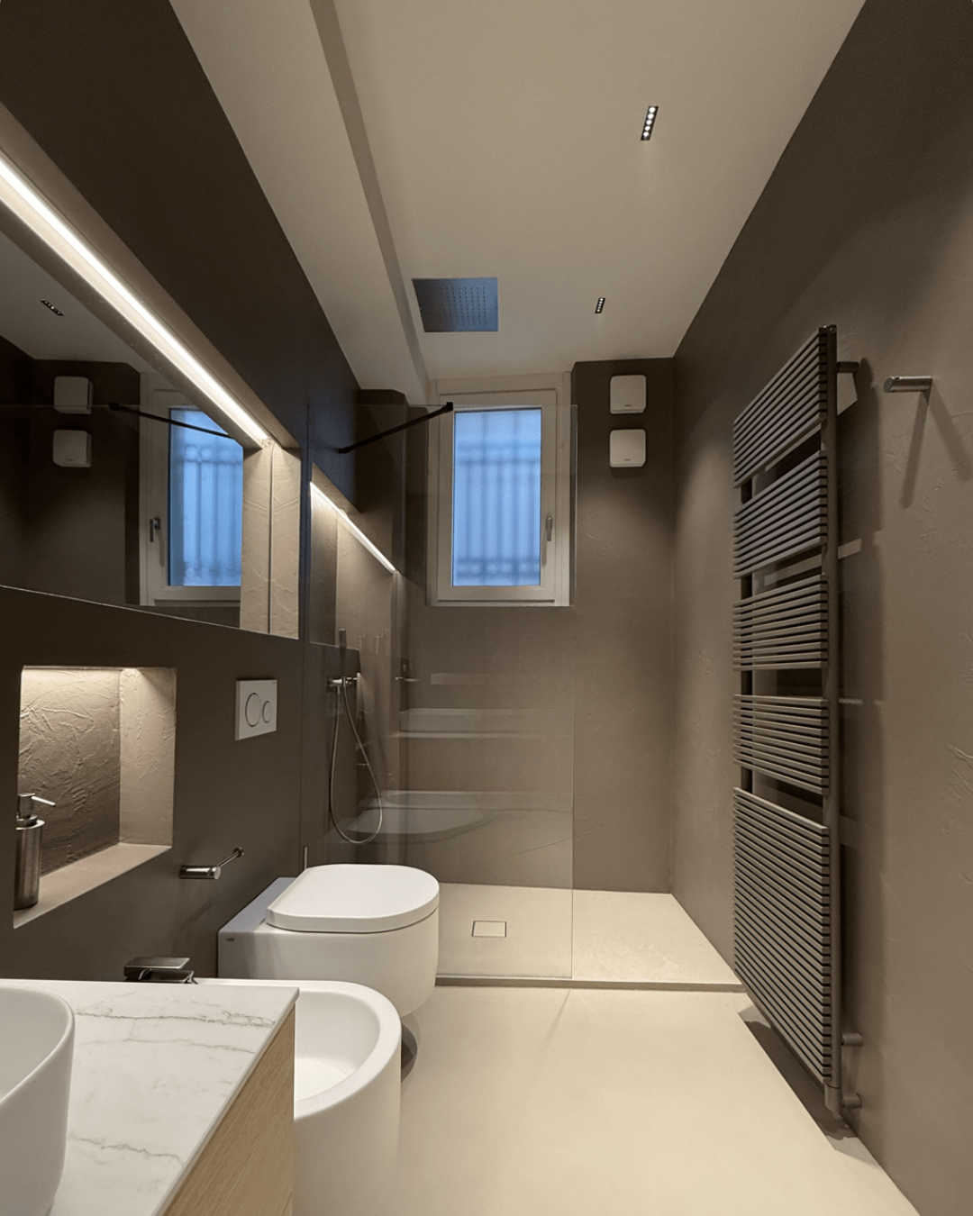 Il mobile sospeso in legno soddisfa la funzione del contenere. Le nicchie luminose caratterizzano l’intera parete, mentre rubinetteria e termoarredo completano il progetto attraverso linee essenziali e finiture ricercate.